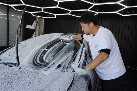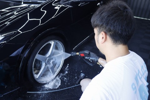 たとえば、泥や砂利の付着しているホイール・タイヤから入念に洗浄し、洗浄後は細かな砂がボディに飛ばないよう、タイヤをカバー。ボディ全体に泡をかけて汚れを浮かせている間、スタッフがウィンドウ周りといった細かな部分を丁寧に洗浄します。